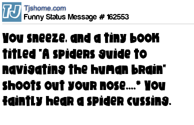 X says You sneeze, and a tiny book titled "A spiders guide to navigating the human brain" shoots out your nose....* You faintly hear a spider cussing.