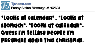 X says *looks at calendar*.. *looks at stomach*. *looks at calendar*.. Guess I'm telling people I'm pregnant again this Christmas.