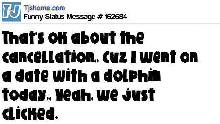 X says That's ok about the cancellation,, Cuz I went on a date with a dolphin today,, Yeah, we just clicked.
