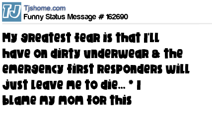 X says My greatest fear is that I'll have on dirty underwear & the emergency first responders will just leave me to die... * I blame my mom for this