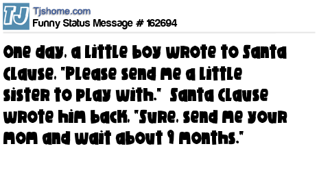 X One day, a little boy wrote to Santa Clause, "Please send me a little sister to play with." Santa Clause wrote him back, "Sure, send me your mom and wait about 9 months."