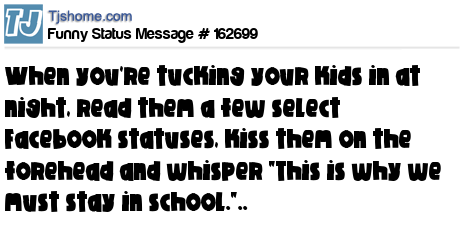 X says When you're tucking your kids in at night, read them a few select Facebook statuses, kiss them on the forehead and whisper "This is why we must stay in school."..