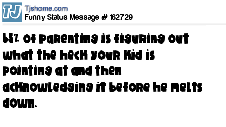 X says 65% of parenting is figuring out what the heck your kid is pointing at and then acknowledging it before he melts down.