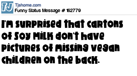X says I'm surprised that cartons of Soy Milk don't have pictures of missing vegan children on the back.