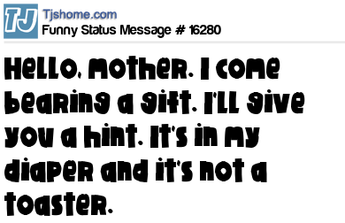 - # 16281 My son is on 11 months and can't talk but sometimes I think it's fun to imagine what he would say if he could... like this morning; I imagined him saying "Hello, mother. I come bearing a gift. I'll give you a hint. It's in my diaper and it's not a toaster