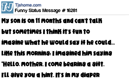 X is My son is on 11 months and can't talk but sometimes I think it's fun to imagine what he would say if he could... like this morning; I imagined him saying "Hello, mother. I come bearing a gift. I'll give you a hint. It's in my diaper and it's not a toaster