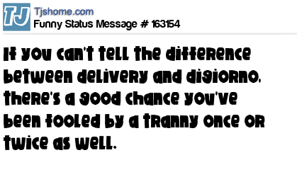 - # 183334 If you can't tell the difference between delivery and DiGiorno there's a good chance you've been fooled by a tranny once or twice too