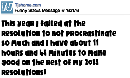 X says This year I failed at the resolution to not procrastinate so much and I have about 11 hours and 45 minutes to make good on the rest of my 2015 resolutions!