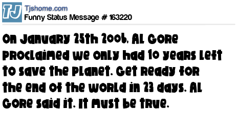 X On January 25th 2006, Al Gore proclaimed we only had 10 years left to save the planet. Get ready for the end of the world in 23 days. Al Gore said it. It must be true.