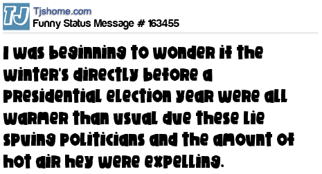 X I was beginning to wonder if the winter's directly before a presidential election year were all warmer than usual due these lie spuing politicians and the amount of hot air hey were expelling.