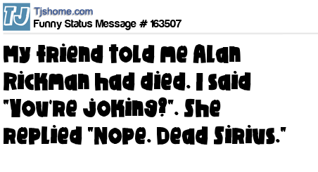 X says My friend told me Alan Rickman had died. I said "You're joking?". She replied "Nope. Dead Sirius."