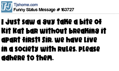 X says I just saw a guy take a bite of Kit Kat bar without breaking it apart first! Sir, we have live in a society with rules, please adhere to them.