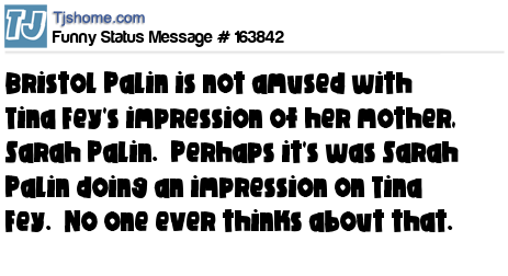 X says Bristol Palin is not amused with Tina Fey's impression of her mother, Sarah Palin. Perhaps it's was Sarah Palin doing an impression on Tina Fey. No one ever thinks about that.