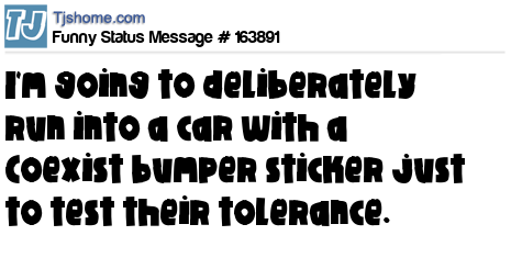 X says I'm going to deliberately run into a car with a Coexist bumper sticker just to test their tolerance.