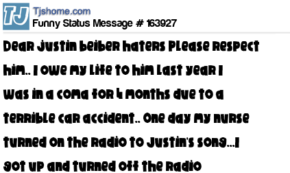 - # 105405 Dear JB HATERs – I owe my life to Justin. On March 9th, 2009 I was in a coma for 6 months after a terrible car crash. One day my nurse turned the radio to Justin's song, so I got up, and turned the radio off.