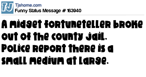 X says A midget fortuneteller broke out of the county jail. Police report there is a small medium at large.