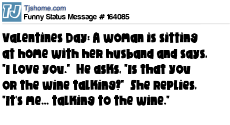 X says Valentines Day: A woman is sitting at home with her husband and says, "I love you." He asks, "Is that you or the wine talking?" She replies, "It's me... talking to the wine."