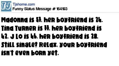 X says Madonna is 57, her boyfriend is 24. Tina Turner is 77, her boyfriend is 42. J Lo is 46, her boyfriend is 28. Still single? Relax, your boyfriend isn't even born yet.
