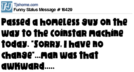 X passed a homeless guy on the way to the Coinstar machine today. "Sorry, I have no change"...man was that awkward.....
