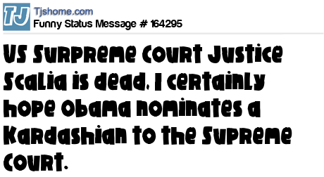 X says US Surpreme Court Justice Scalia is dead, I certainly hope Obama nominates a Kardashian to the Supreme Court.