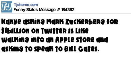 X Kanye asking Mark Zuckerberg for $1billion on Twitter is like walking into an Apple store and asking to speak to Bill Gates.