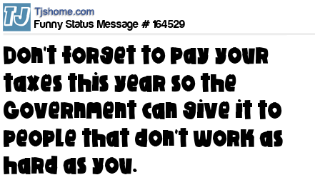 X says Don't forget to pay your taxes this year so the Government can give it to people that don't work as hard as you.
