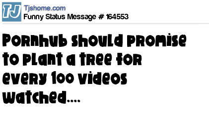 - # 148818 Porn Hub has pledged to plant a new tree for every hundred videos viewed on its site. The amount of tissue paper I get through, I'm still not sure that's environmentally sustainable.