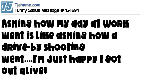 X says Asking how my day at work went is like asking how a drive-by shooting went....I'm just happy I got out alive!