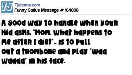 X says A good way to handle when your kid asks, "Mom, what happens to me after I die?".. is to pull out a trombone and play "waa waaaa" in his face.