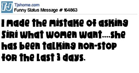 - # 100574 Apparently it was a bad idea to ask Siri, "What do women want?" She's been talking for the last 2 days and doesn't seem ready to shut up anytime soon.