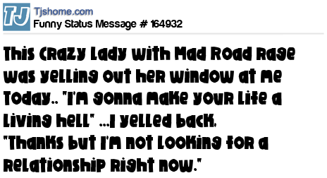 - # 175177 This Crazy lady with Mad Road rage was yelling out her window at me this morning before work.... "I'm gonna make your life a living hell" ...I yelled back, "Thanks but I'm already married."