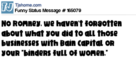X No Romney, we haven't forgotten about what you did to all those businesses with Bain Capital or your "binders full of women."