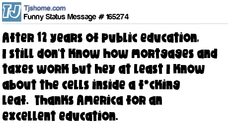 X says After 12 years of public education, I still don't know how mortgages and taxes work but hey at least I know about the cells inside a f*cking leaf. Thanks America for an excellent education.