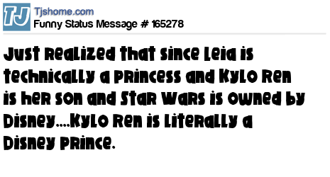 X says Just realized that since Leia is technically a princess and Kylo Ren is her son and Star Wars is owned by Disney....Kylo Ren is literally a Disney prince.