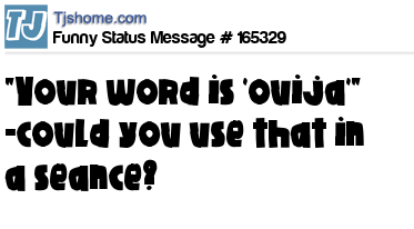 - # 65375 My Ouija board keeps saying "Boo! LOL J/K!" Stupid teenage ghosts.