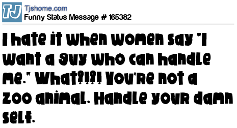 X says I hate it when women say "I want a guy who can handle me." What?!?! You're not a zoo animal. Handle your damn self.