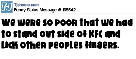 - # 99914 when I was growing up, we were so poor we would go to Kentucky Fried Chicken to lick other peoples fingers.