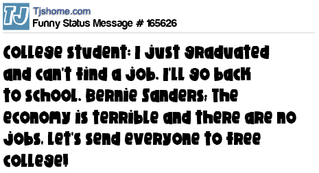 X says College student: I just graduated and can't find a job. I'll go back to school. Bernie Sanders; The economy is terrible and there are no jobs, let's send everyone to free college!
