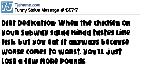 X says Diet Dedication: When the chicken on your Subway salad kinda tastes like fish, but you eat it anyways because worse comes to worst, you'll just lose a few more pounds.