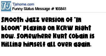 X says Smooth jazz version of "In bloom" playing on KCRW right now. Somewhere Kurt Cobain is killing himself all over again.