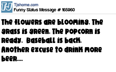 X says The flowers are blooming. The grass is green. The popcorn is ready. Baseball is back. Another excuse to drink more beer....