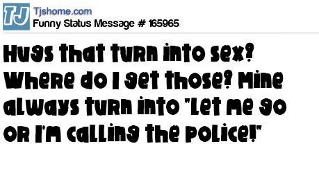 - # 157709 Hugs that turn into sex? Where do I get those? Mine always turn into "Let me go or I'm calling the police."