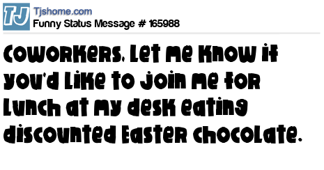 X says Coworkers, let me know if you'd like to join me for lunch at my desk eating discounted Easter chocolate.