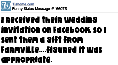 X says I received their wedding invitation on Facebook, so I sent them a gift from Farmville....figured it was appropriate.
