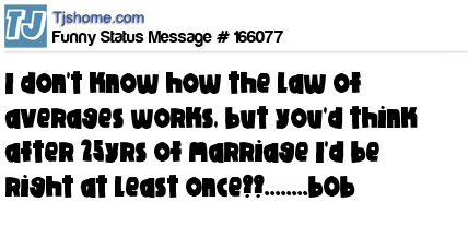 X says I don't know how the law of averages works, but you'd think after 25yrs of marriage I'd be right at least once??........bOb