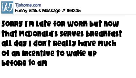 X  Sorry I'm late for work but now that McDonald's serves breakfast all day I don't really have much of an incentive to wake up before 10 am