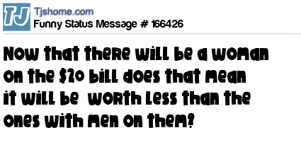 - # 166390 The good news is they're putting a woman on the $20 dollar bill... The bad news is it will be worth only $14.