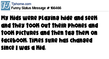 X says My kids were playing hide and seek and they took out their phones and took pictures and then tag them on facebook. Times sure has changed since I was a kid.