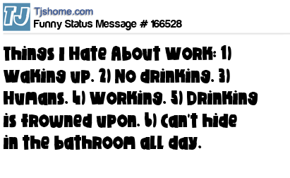 X says Things I Hate About Work: 1) Waking up. 2) No drinking. 3) Humans. 4) Working. 5) Drinking is frowned upon. 6) Can't hide in the bathroom all day.