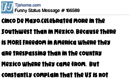 X Cinco De Mayo,Celebrated more in the Southwest than in Mexico, Because there is MORE Freedom in America where they are trespassing than in the country Mexico where they came from. But constantly complain that the US is not enough like Mexico